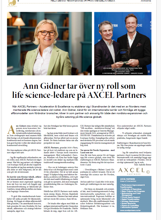 “I am delighted to join AXCEL Partners at a time when the Life Science sector is facing significant change,” says Ann Gidner. “AXCEL combines strong strategic insight with hands-on operational execution. This is exactly what companies need to succeed in complex and highly regulated environments.